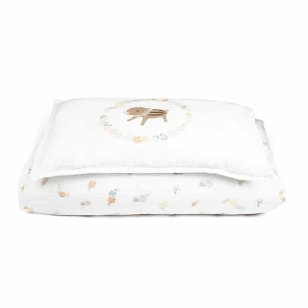 Beim „Flower-Motiv“, ist der süße Frischling Marli auf dem Kopfkissen verewigt und von einem wunderschönen Blumenkranz umgeben. Die Blumen finden sich auch auf der Decke wieder. Einen niedlicheren Einschlafbegleiter kann man sich nicht vorstellen.