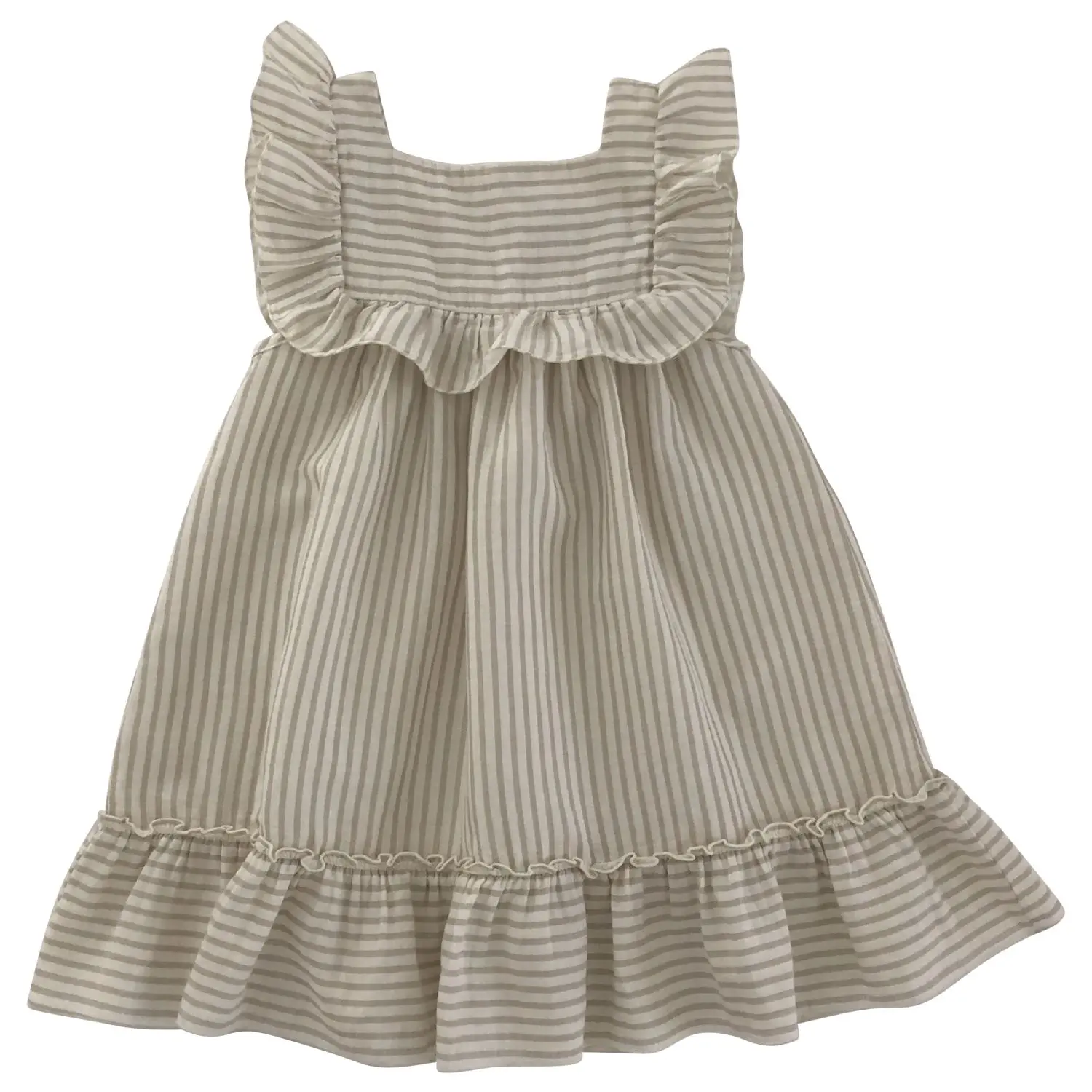Das Kleid Lina Sandy Stripes ist das Sommer-Kleid von Liilu mit lockerer Passform, kurzen Ärmeln und wunderschönen Volant-Details. Auf der Rückseite sind Fischgrätenbänder zum Binden aufgenäht.