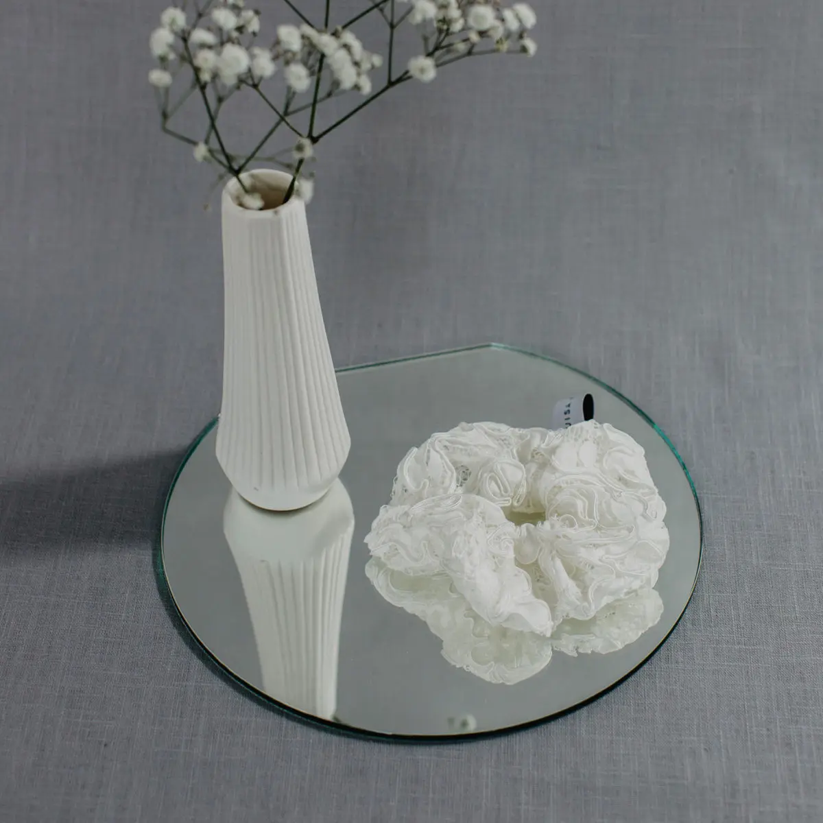 Das Scrunchie aus Spitze ist das ideale Accessoire für die modische Braut. Sowohl um einen hohen Dutt als auch einen tiefen Zopf wirkt es modisch und elegant zugleich. Auch am Handgelenk getragen ist es ein schmeichelndes Accessoire. Im Inneren des Scrunchies befindet sich ein Spiralgummi. Dieses gibt besonders guten Halt und verhindert zudem Haarbruch.