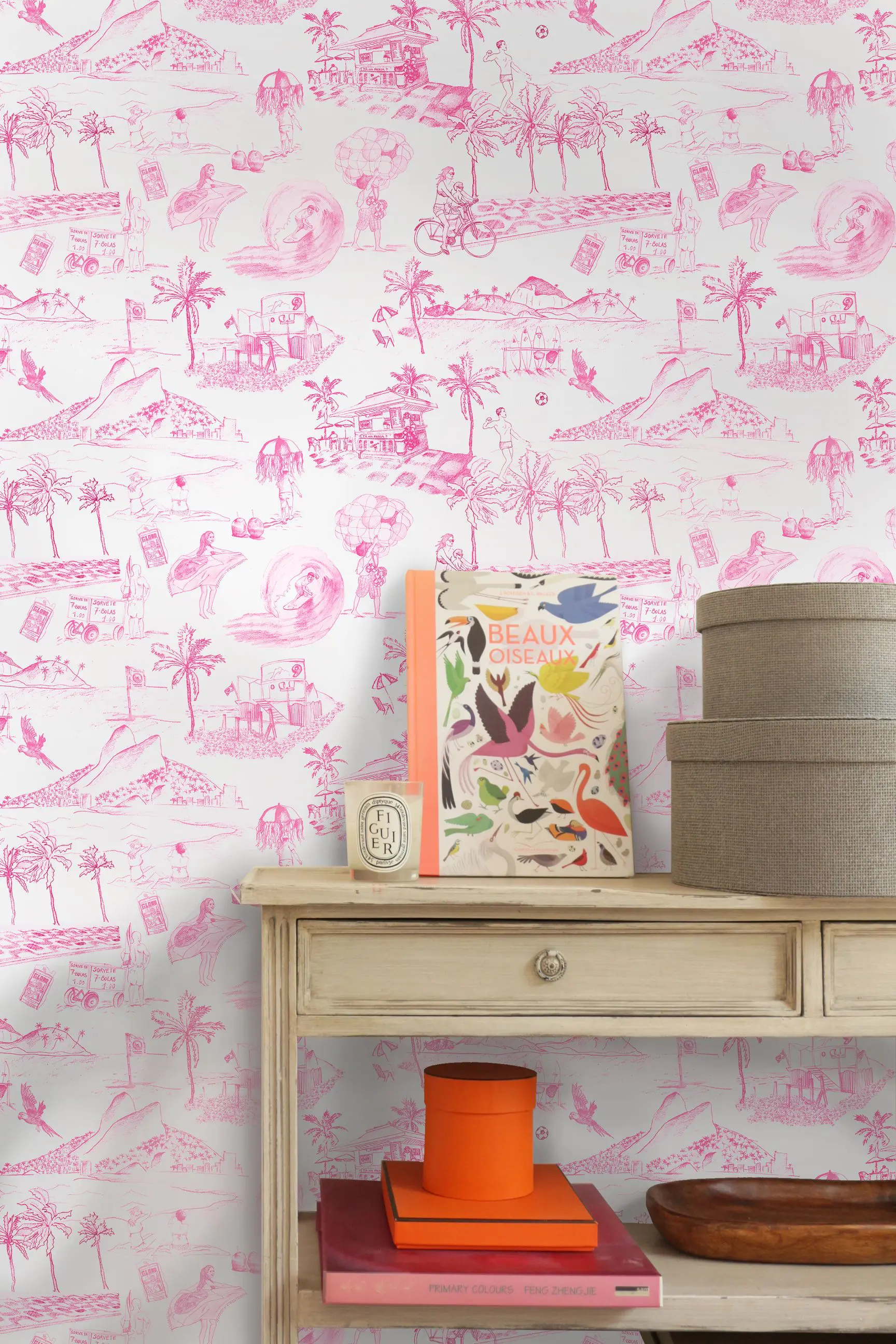 Matte Vliestapete, die den Alltag am berühmten Strand von Ipanema, in Rio de Janeiro, zeigt. Dieses Design verleiht dem Stil von Toilede Jouy einen modernen Touch. Perfekt für ein Spiel- oder Kinderzimmer, ist es auch ideal in jedem Raum des Hauses.
